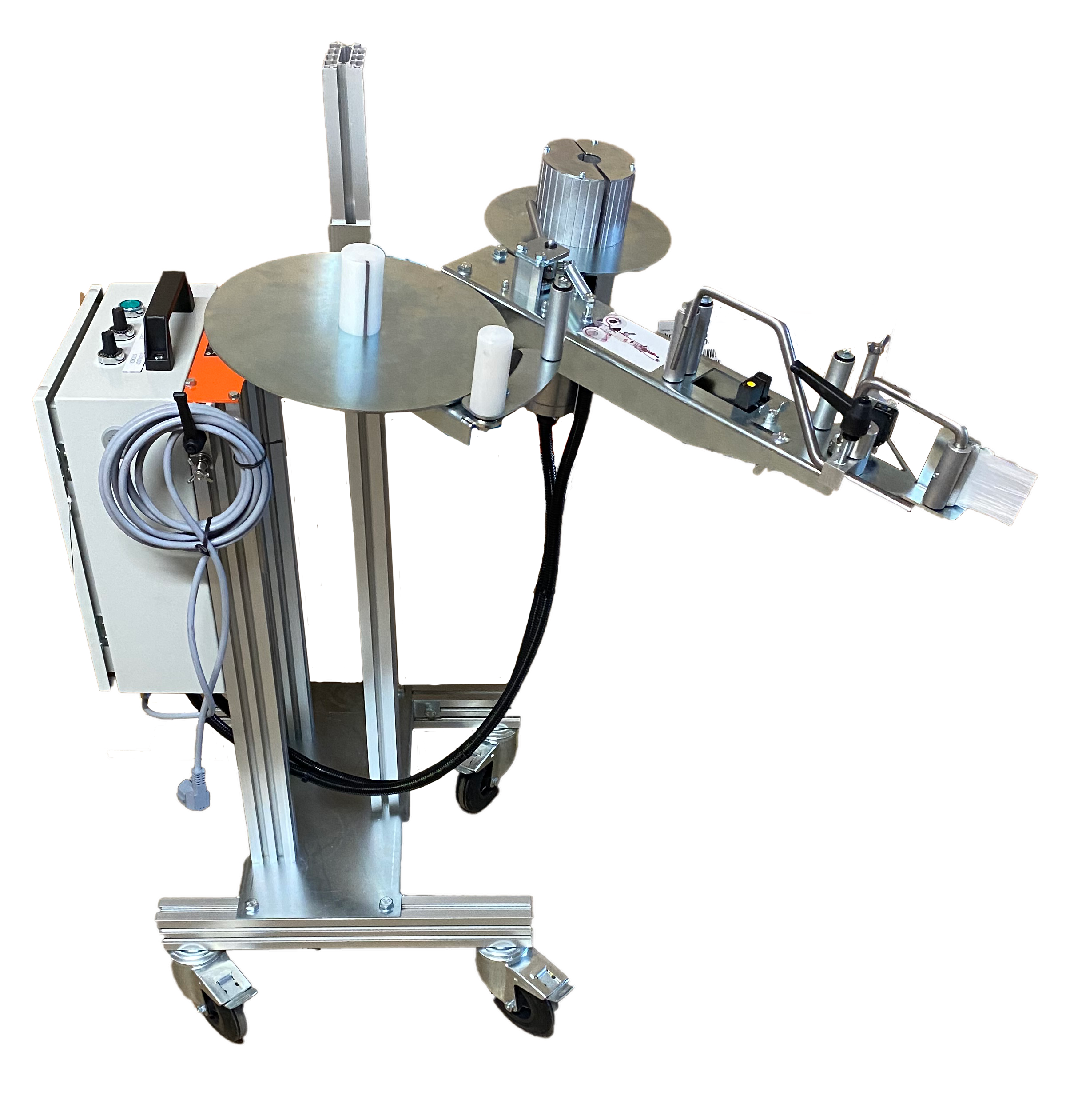 Eine Etikettiermaschine bringt selbstklebende Etiketten an und wird standardmäßig auf einem fahrbaren Rahmen geliefert, den Sie ganz einfach neben einem vorhandenen Förderband aufstellen können. Der Rahmen ist höhenverstellbar, sodass Sie selbst entscheiden können, wo Sie das Etikett anbringen. Die Maschine kann sogar auf den gewünschten Neigungswinkel eingestellt werden, z.B. zum Bekleben eines Topfes. Sowohl die Ausgabegeschwindigkeit als auch die Förderlänge können durch die Drehknöpfe bequem eingestellt werden. So werden Ihre Etiketten immer gerade und an die richtige Stelle geklebt.