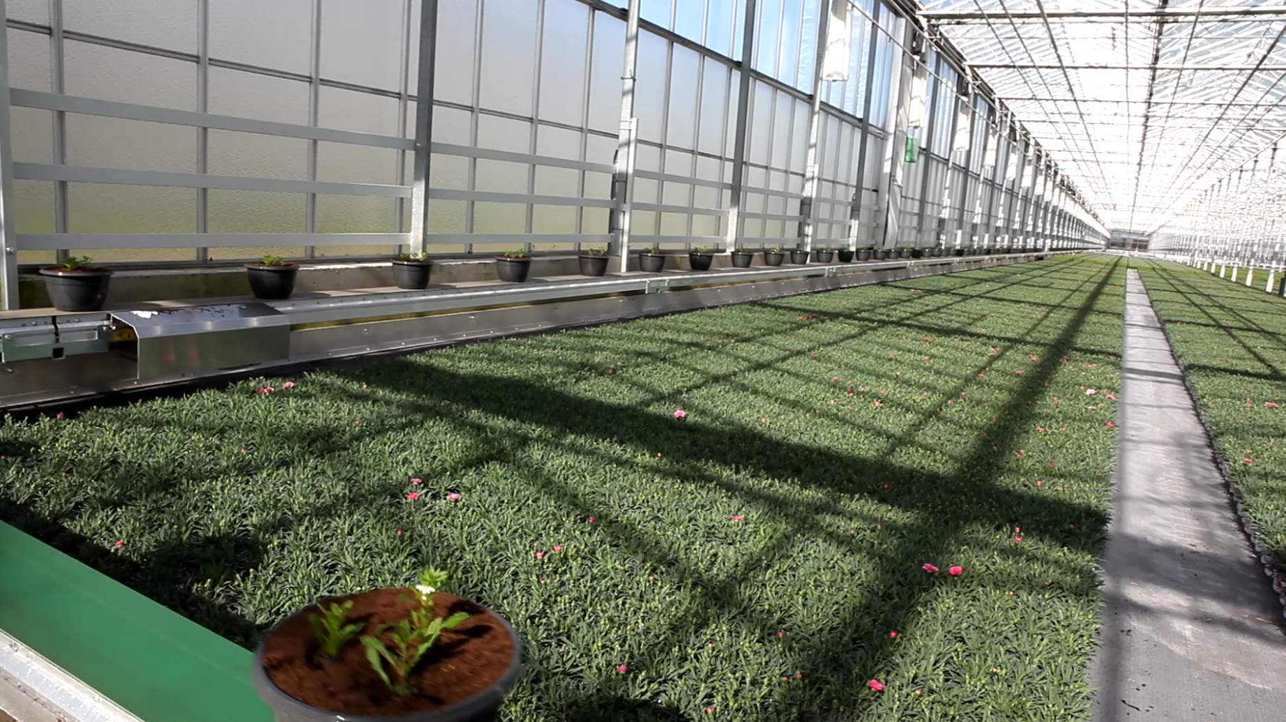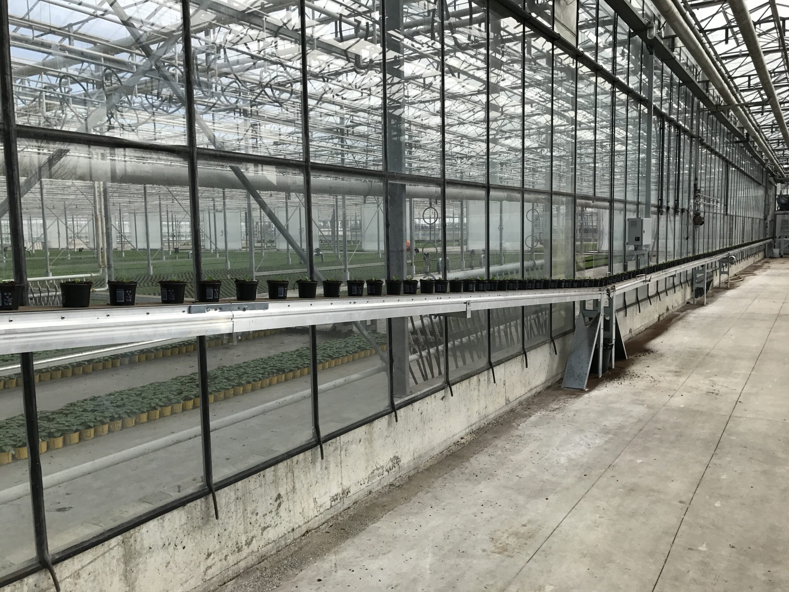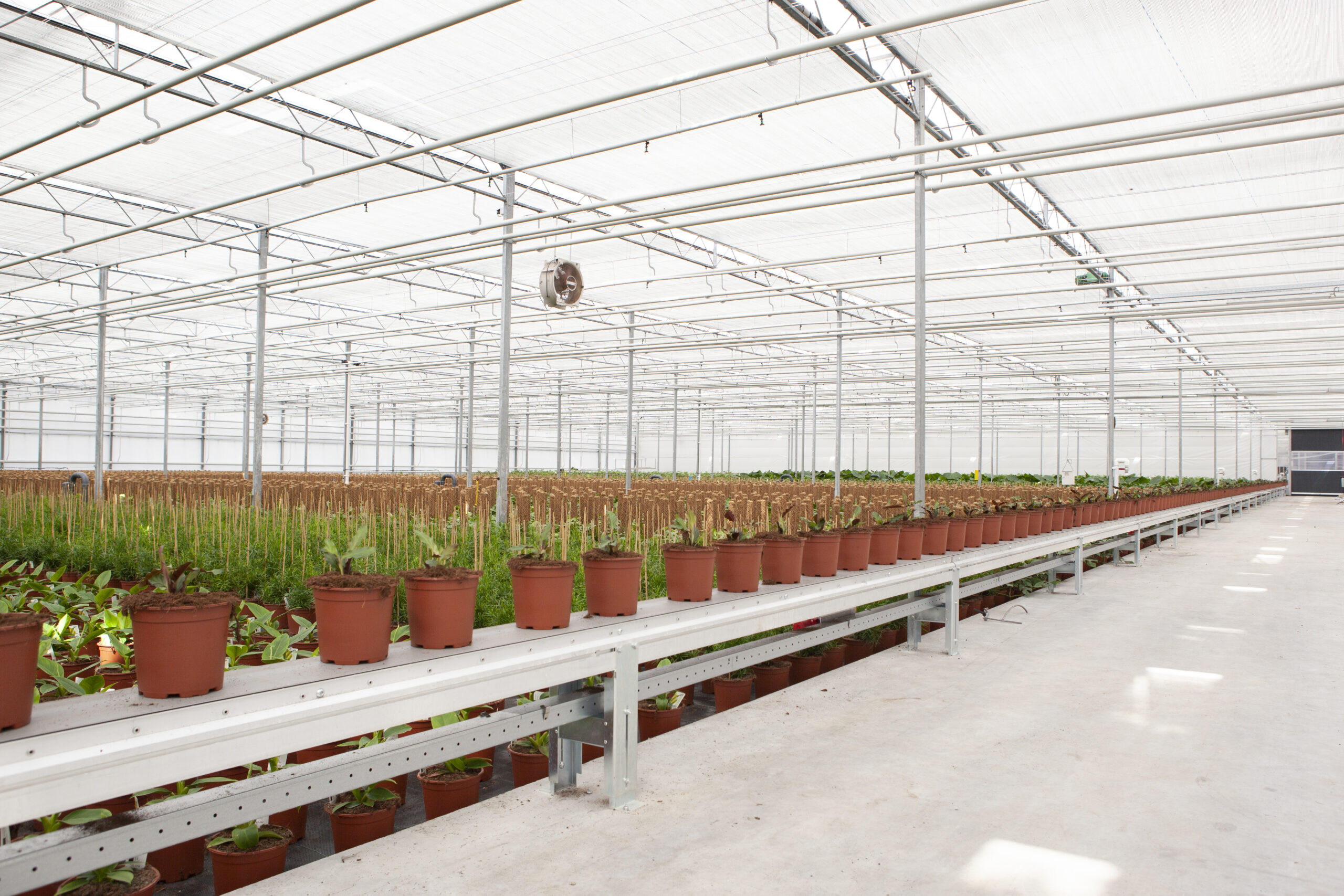 In addition to the well-known link belts, we also have fixed conveyors. These are longer conveyor belts in a fixed set-up. How these conveyor belts are used in actual practice depends on several variables. Which plants in which pot sizes go over the conveyor belt, do trays go over the conveyor belt, and do users want to be able to walk across the conveyor belt?