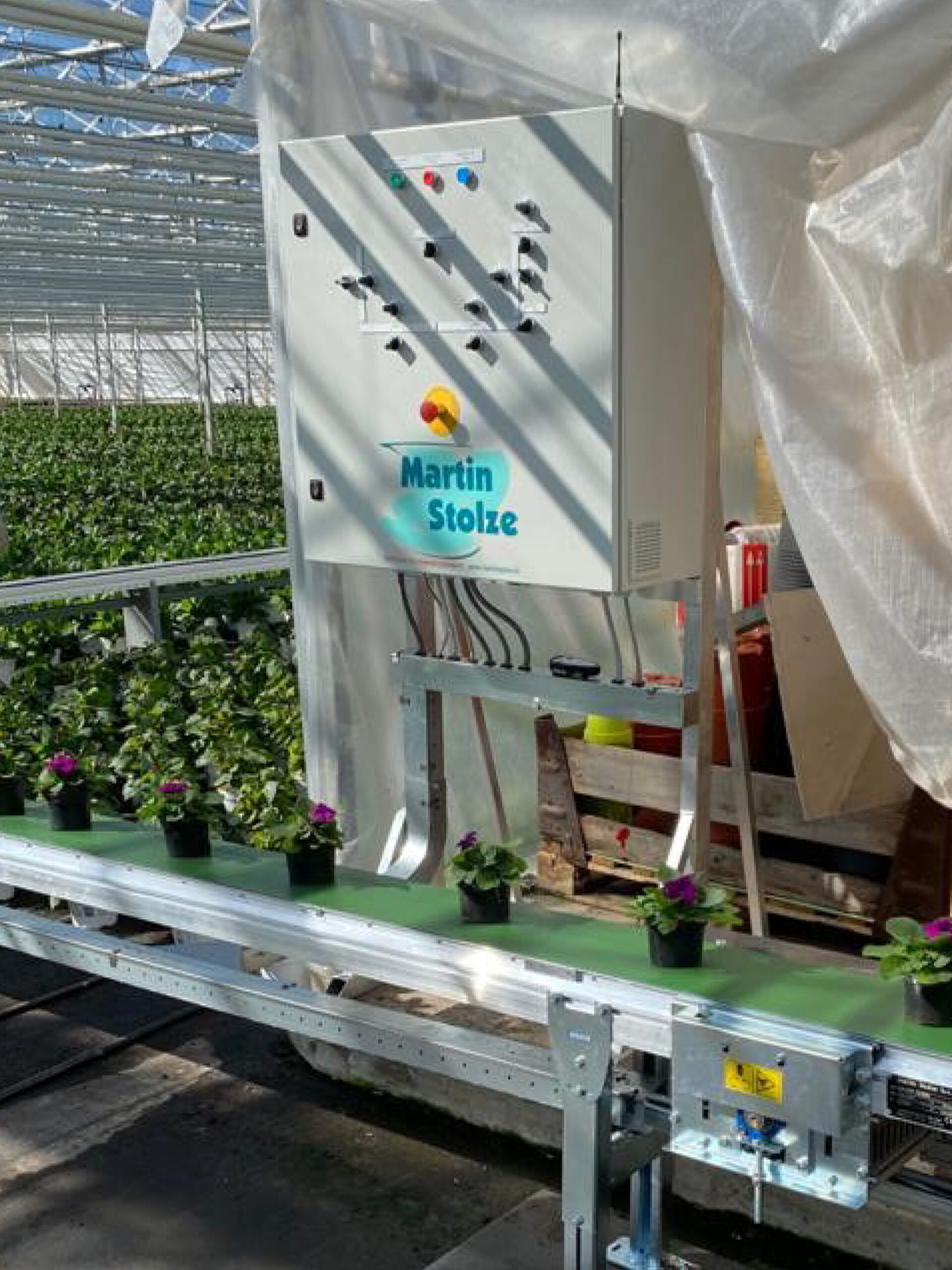 The fixed conveyor belt system can be installed with various technical features. A control box with a touch screen is often installed which you can easily enter all the routes on. Various routes can be operational at the same time, for example for potting and delivering the plants. It’s also possible to integrate a remote control for starting and stopping the belts.