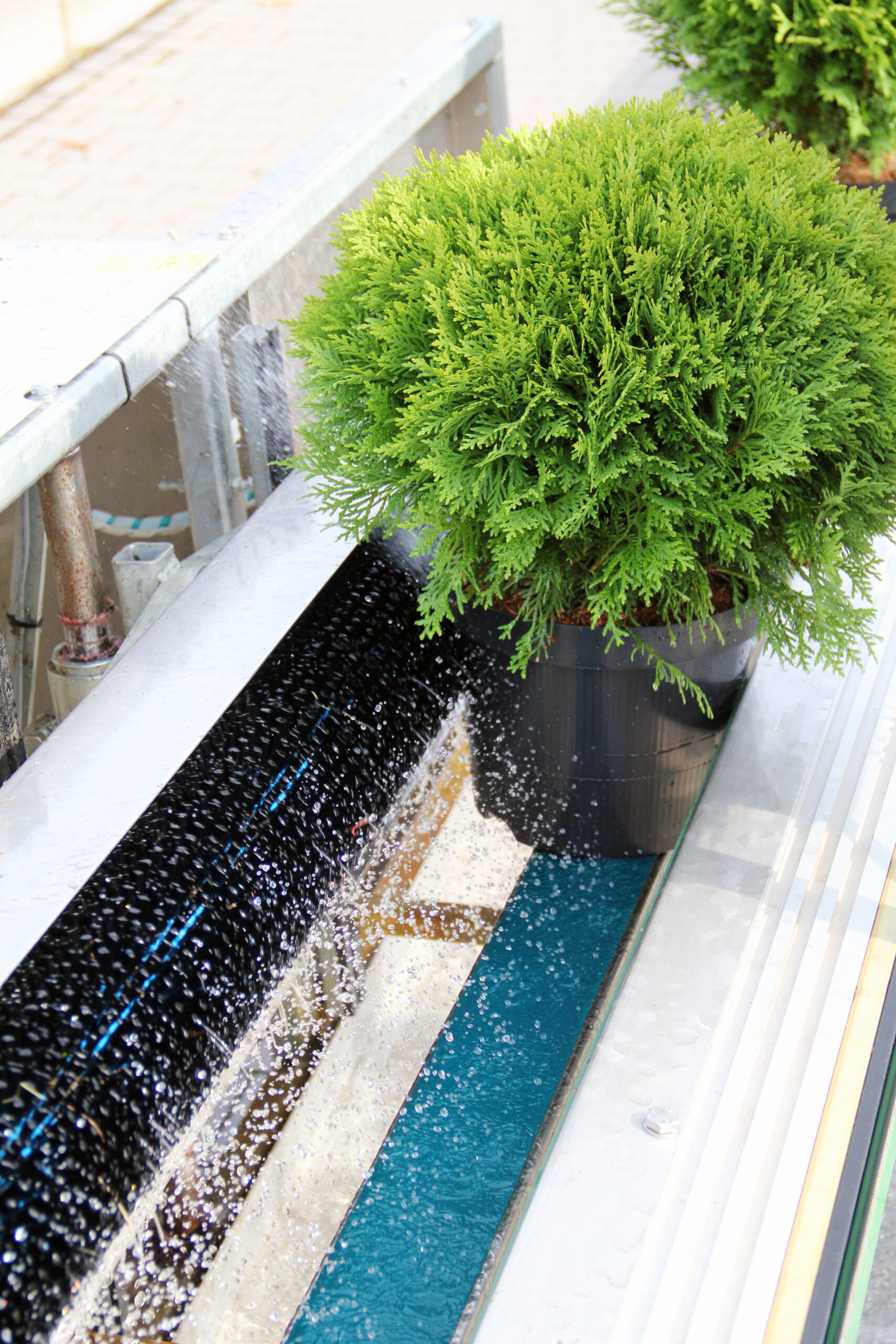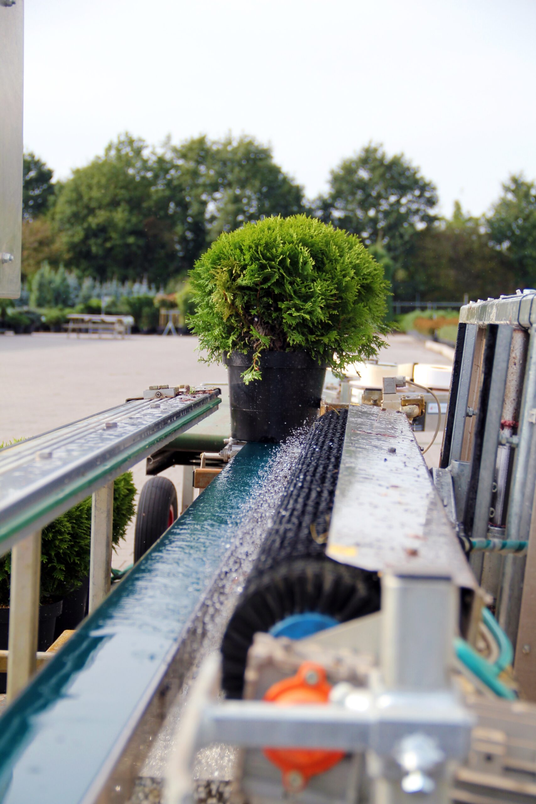The pot washer makes sure your plant pots are neat and clean before delivery to your customer. The pots are transported via the built-in conveyor belt which has a stainless-steel frame. The pots are rotated on the conveyor belt so that the rotary brush can effortless clean every side of the pot with water. Dirt and water that come loose are neatly disposed of in the water collection container. The speed of the conveyor belt, the belt drive (which rotates the pot) and the up and down movement of the brushes can all be adjusted as required.