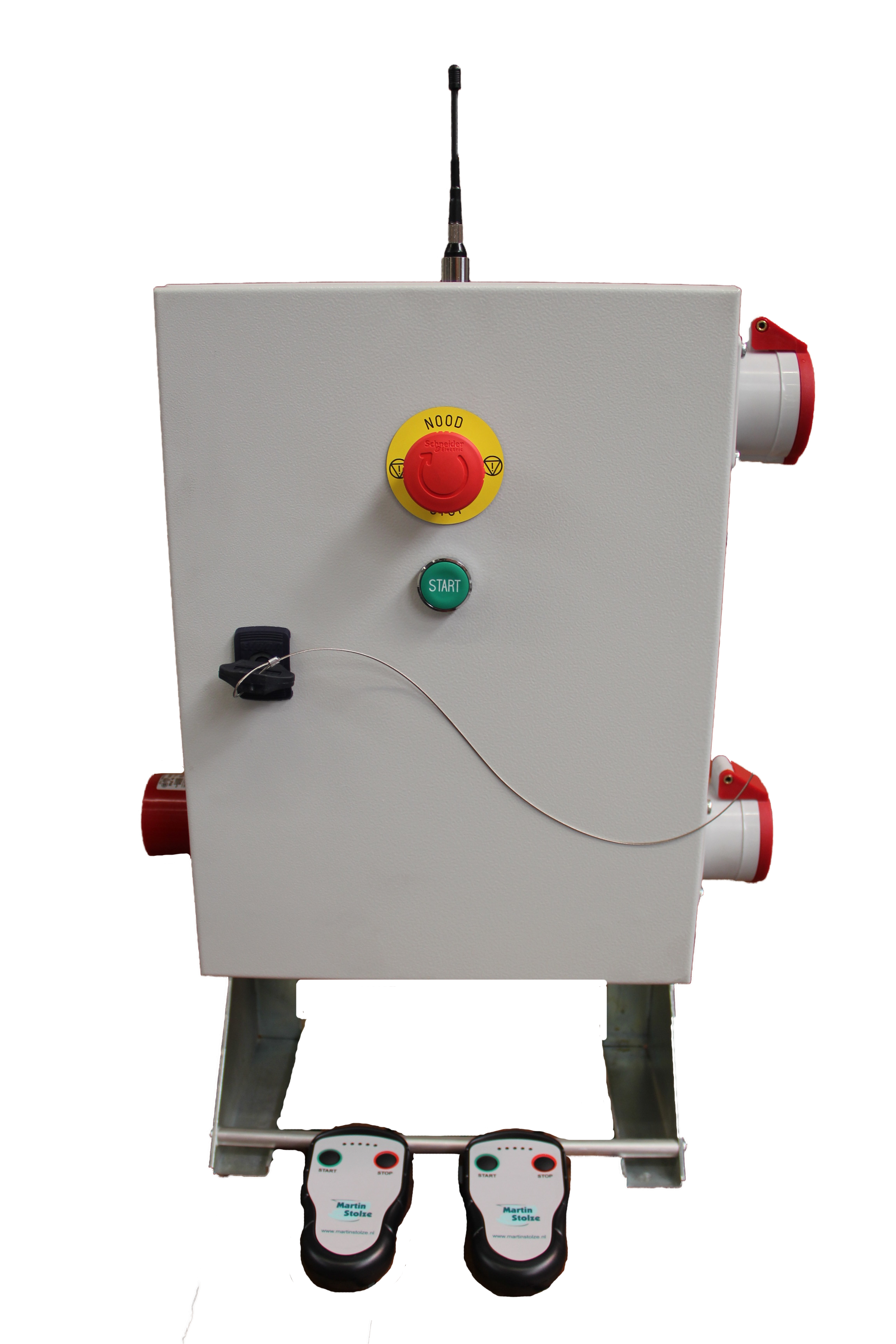 Met deze draadloze afstandsbediening kunt u de transportbanden vanaf iedere plek starten en stoppen. Indien deze in het bereik is van de ontvanger.