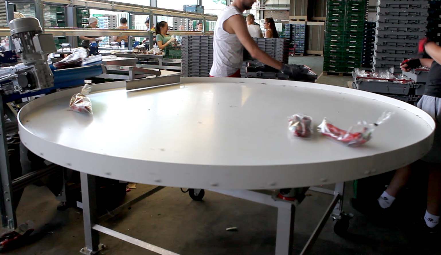 De draaitafel is het ideale middel om eenvoudig producten te bufferen en handmatig te verwerken. Wanneer uw systeem zowel machinaal als handmatig verpakt, zijn draaitafels gewenst voor een korte tussentijdse opslag van producten die al zijn verpakt voordat ze in dozen of op pallets worden verpakt. Draaitafels worden overal gebruikt waar een soepel verder transport van de verpakte goederen belangrijk is, bijvoorbeeld binnen verpakkingslijnen. De ronde plaat is roteerbaar gemonteerd en wordt aangedreven door een motor. Aan de draaitafels kunnen rollenbanen of transportbanden gemonteerd worden. Draaitafels kunnen ook worden gebruikt als een koppeling tussen elkaar kruisende transportbanden of voor het laden en lossen van verschillende goederen. En door verschillende zijgeleidingselementen te gebruiken, kunnen draaitafels ook ingezet worden als opslag- of sorteerapparaten. Er zijn sorteersystemen voor een grote verscheidenheid aan producten, omdat elk product verschillende sorteercriteria heeft.